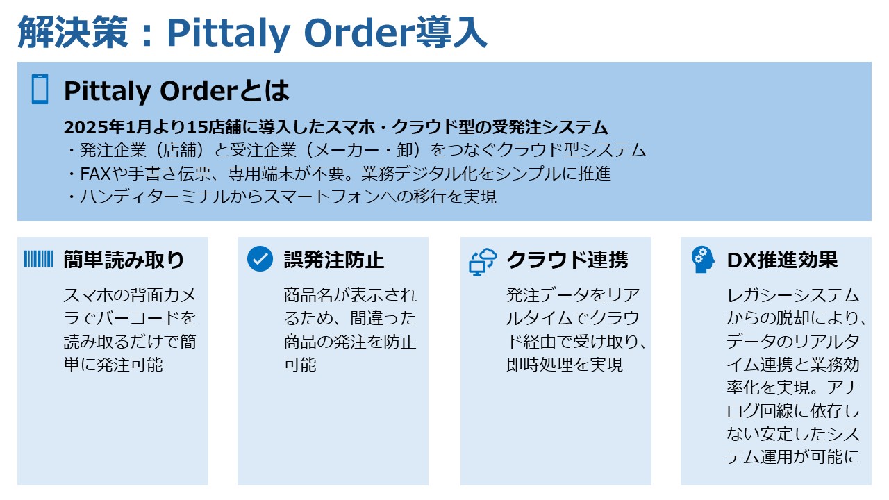 これらの課題から、ニッケン文具ではハンディターミナルに代わる新たな店舗発注の仕組みの検討を開始しました。その結果、2025年1月にPittaly Orderを導入しています。Pittaly Orderを選定した理由は次の通りです。